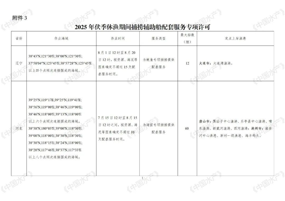 三、捕捞辅助船配套服务专项许可2025年为特殊经济品种专项捕捞和4种作业类型专项捕捞渔船提供配套服务安排,捕捞辅助船许可作业海域、作业时间、最大船数和定点上岸渔港等详见附件3。公示期为3月28日—4月3日,凡对公示内容有意见者,可通过电子邮件或传真方式于2025年4月3日前反馈。