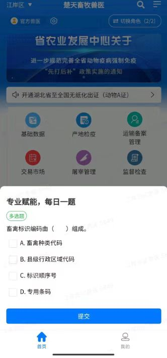 官方兽医每天登录“湖北智慧畜牧兽医+”系统时,系统会从题库中随机抽选一道试题进行验证,完成作答方可登录系统,作答后还会推送专业题解以强化理解。