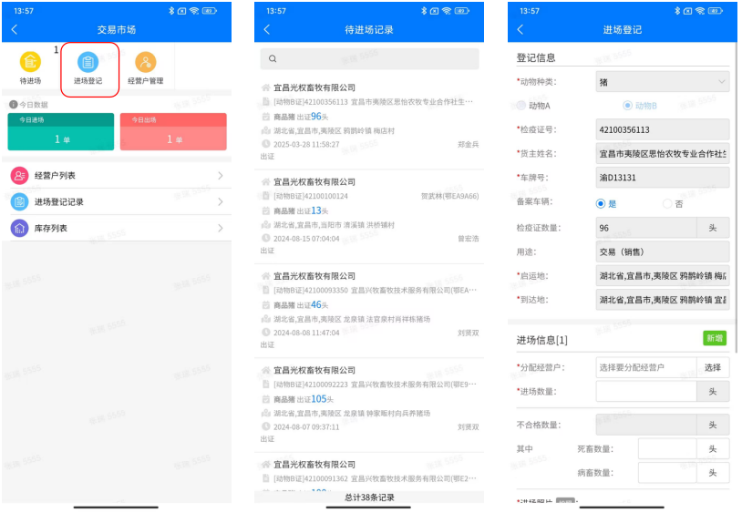 当贩运主体到达交易市场之后,交易市场管理员待进场,做进场登记(落地报告),完成落地报告工作。