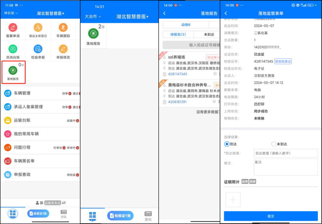 当贩运主体到达目的地之后,贩运车主或承运人登录手机“楚天畜牧兽医”app,进入主界面,点击落地报告模块,进行落地报告操作,拍照、提交,完成落地报告工作。