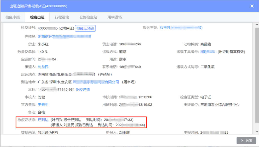 当贩运主体和目的地人员做完落地报告之后,数据自动推送给启运地,启运地出证人员在系统上也能查询到信息。