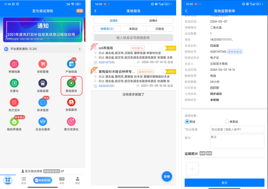 当贩运主体到达养殖场(户)之后,养殖场人员登录手机“楚天畜牧兽医”app,进入主界面,点击落地报告模块,进行落地报告操作,查证验物,没有问题拍照、提交,完成落地报告工作。