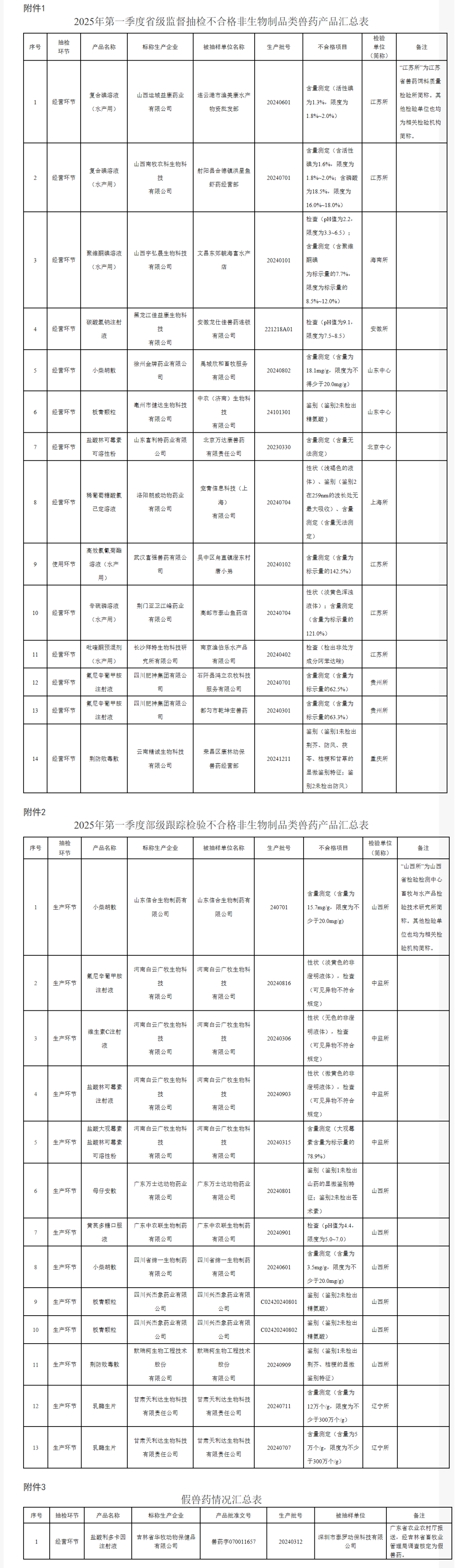 1.2025年第一季度省级监督抽检不合格非生物制品类兽药产品汇总表