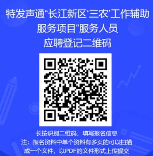扫描“长江新区‘三农’工作辅助服务项目岗位招聘公告”上应聘登记二维码(附件),并按照要求上传所需报名资料。应聘人员只能选报一个岗位,如果重复报名则视为报名无效。所提交信息务必真实、准确、完整、有效。凡存在弄虚作假、信息不全或未按要求提交个人信息等情况者,将取消其应聘资格。