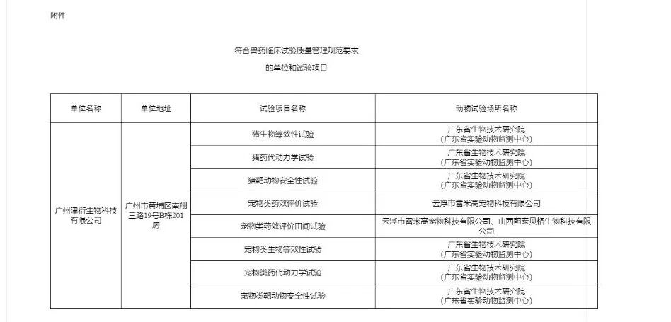 为规范兽药研究活动,根据《兽药管理条例》、《兽药临床试验质量管理规范》、《兽药非临床研究与临床试验质量管理规范监督检查办法》、《兽药非临床研究、兽药临床试验质量管理规范监督检查标准》,以及监督检查相关要求,我局组织专家对广州津衍生物科技有限公司进行了监督检查。经监督检查,广州津衍生物科技有限公司8个试验项目符合兽药临床试验质量管理规范要求,监督检查结果已经公示,现予以公布(详见附件)。详细信息见中国兽药信息网“兽药GLP/GCP监督检查”专栏。