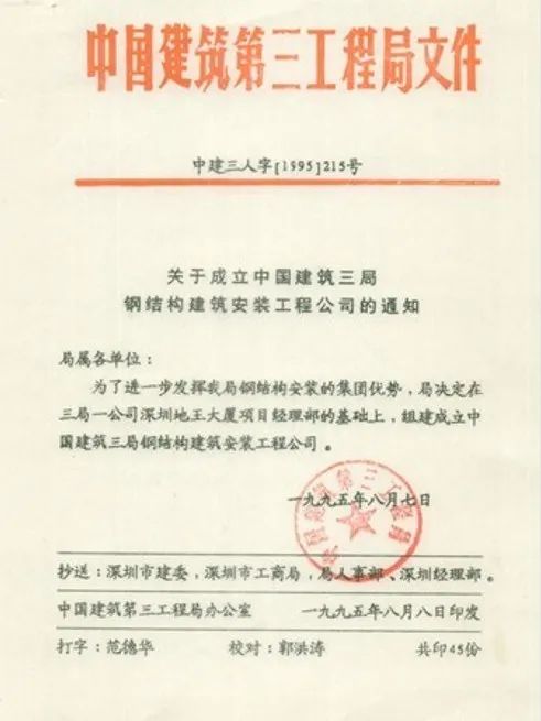 1995年地王大厦封顶后,三局老局长洪可柱以战略思维,敏锐地洞察到钢结构的发展趋势,指示要在地王大厦钢结构项目部的基础上成立一个钢结构专业公司,也就是后来的中建三局钢结构建筑安装工程公司,随后在1996年又注册成立了深圳建升和钢结构建筑安装工程有限公司,实行“一套人马、两块牌子”运作。万事开头难。成立时,缺人手,缺资金,好在我们有中建三局“金字招牌”,还有深圳发展中心和地王大厦好作品。在以后的企业管理中,我们十分注重品牌建设,每接到一个工程都努力干好,从不转包,这样逐步培养出了自己的人才和实力。