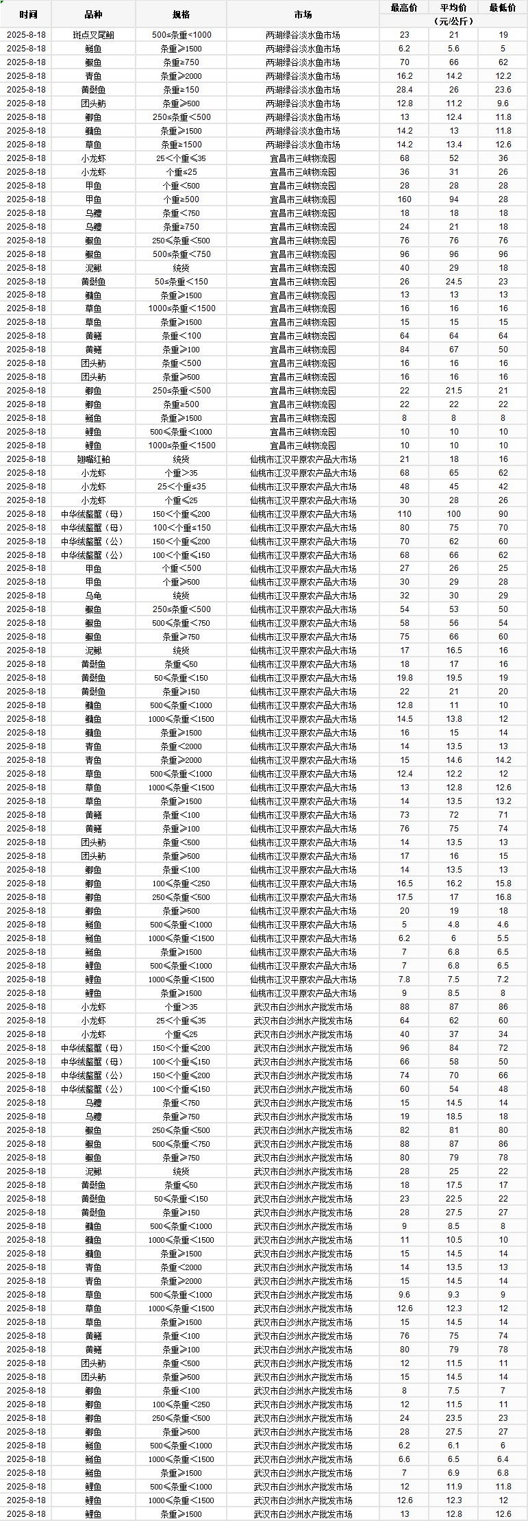 说明:以上各行情来源于“湖北省水产品批发市场信息采集分析平台“,经湖北省农业科技超市授权发布。