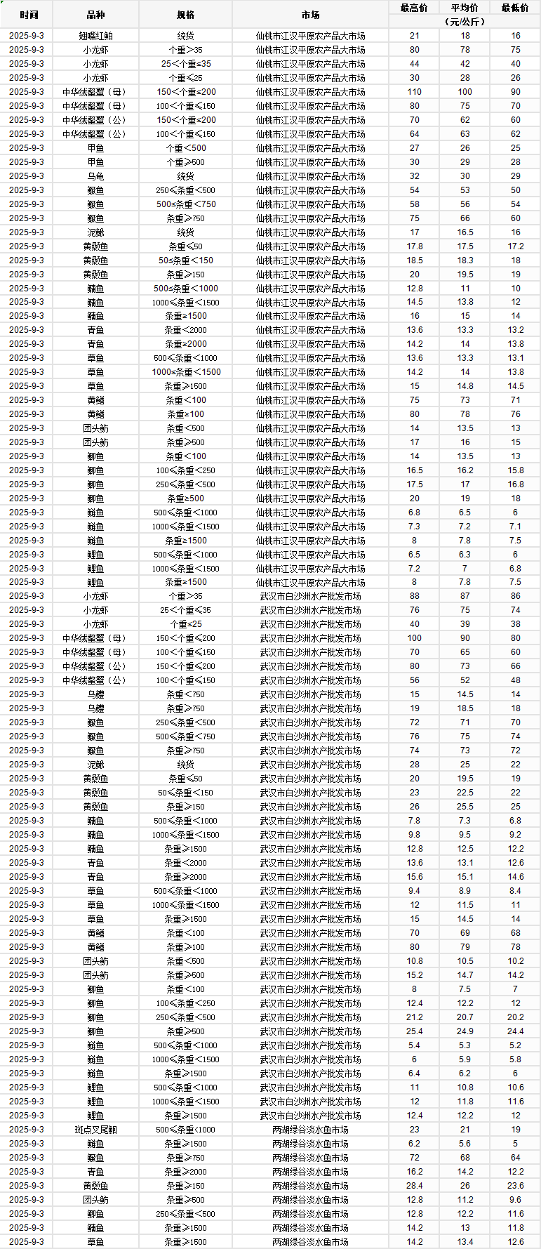 说明:以上各行情来源于“湖北省水产品批发市场信息采集分析平台“,经湖北省农业科技超市授权发布。