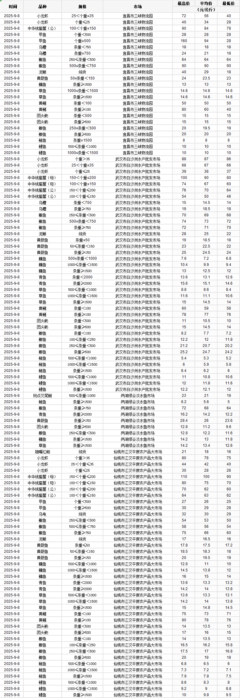 说明:以上各行情来源于“湖北省水产品批发市场信息采集分析平台“,经湖北省农业科技超市授权发布。