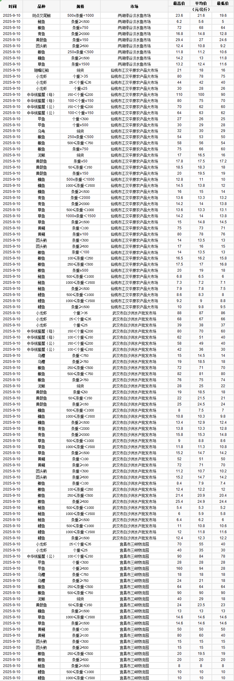 2025年9月10日行情|湖北省主要水产品价格明细