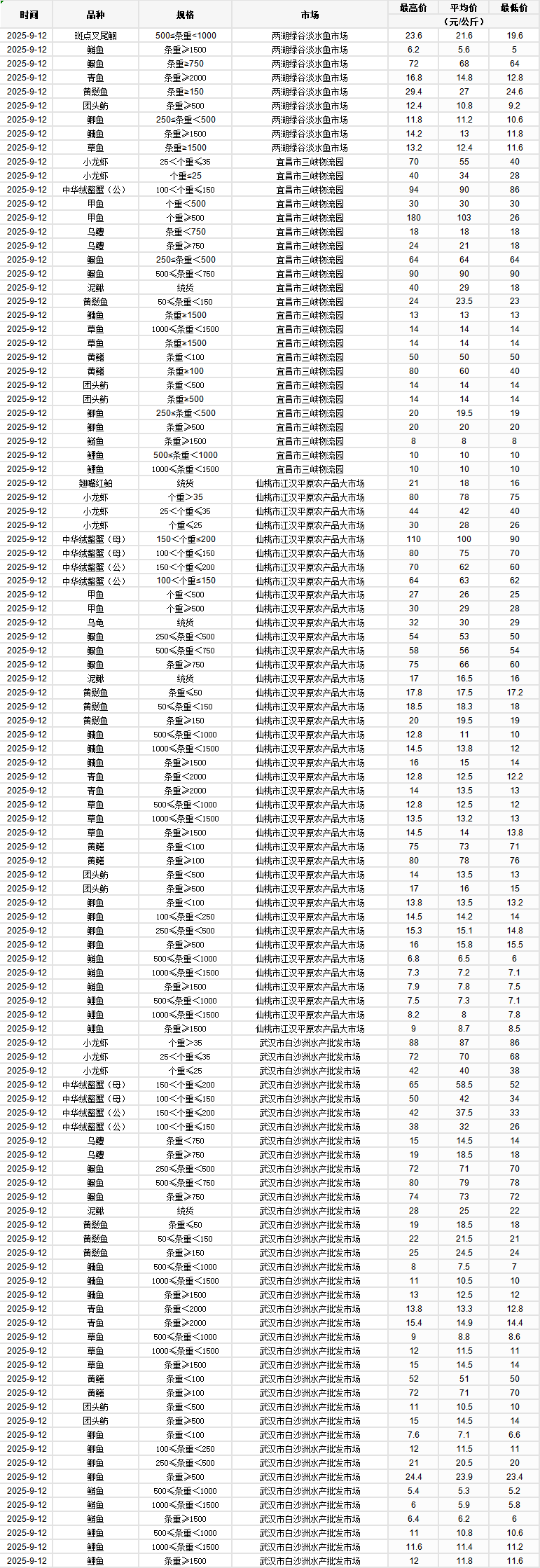 说明:以上各行情来源于“湖北省水产品批发市场信息采集分析平台“,经湖北省农业科技超市授权发布。