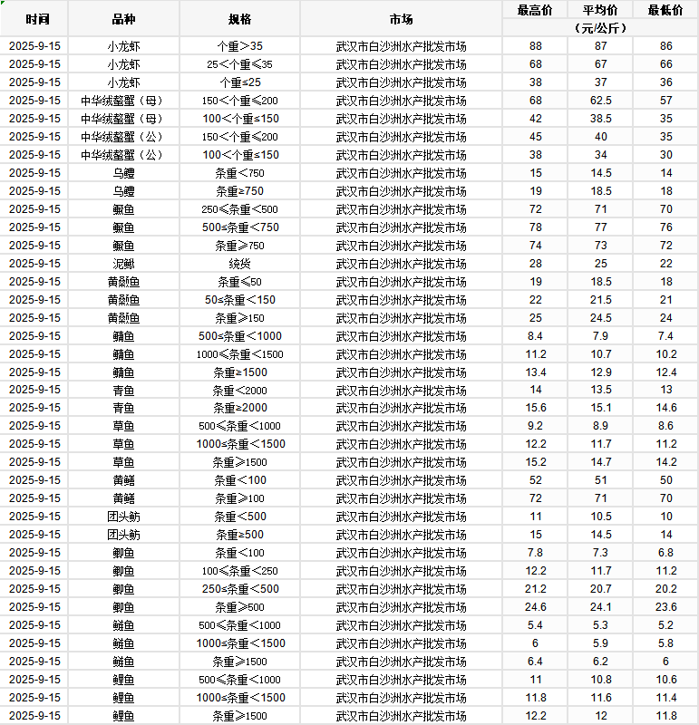 2025年9月15日行情|湖北省主要水产品价格明细