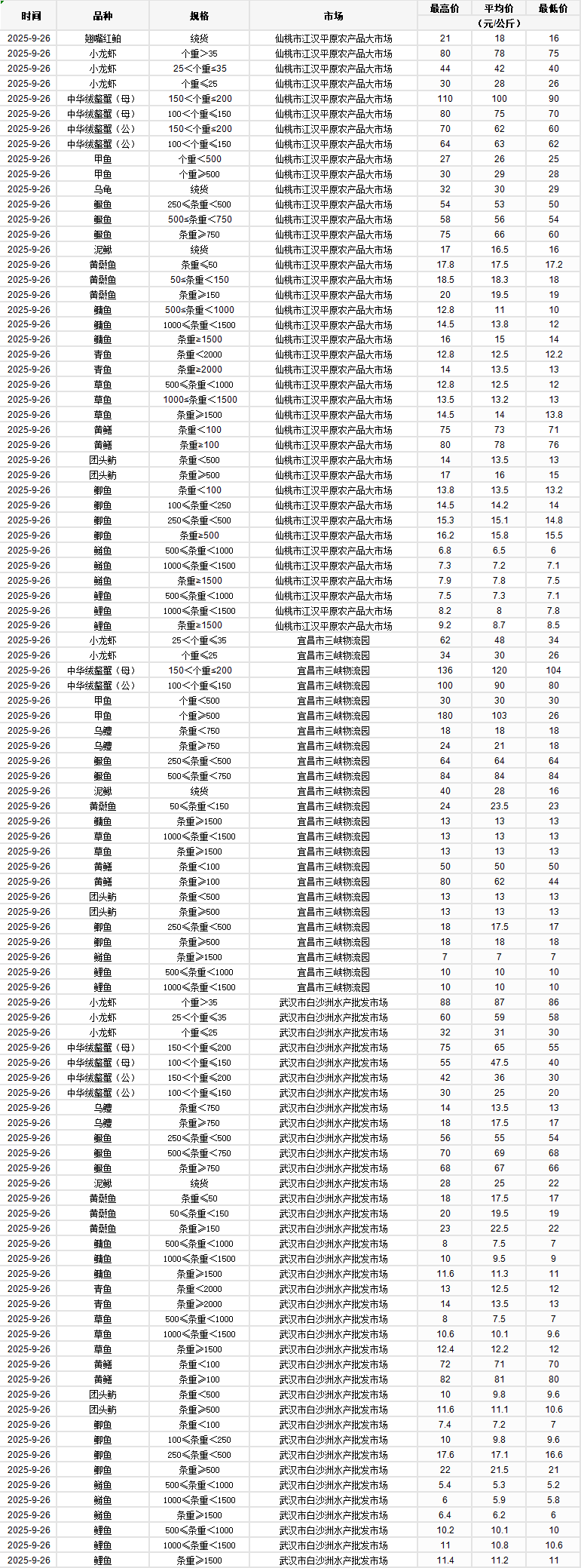 2025年9月26日行情|湖北省主要水产品价格明细