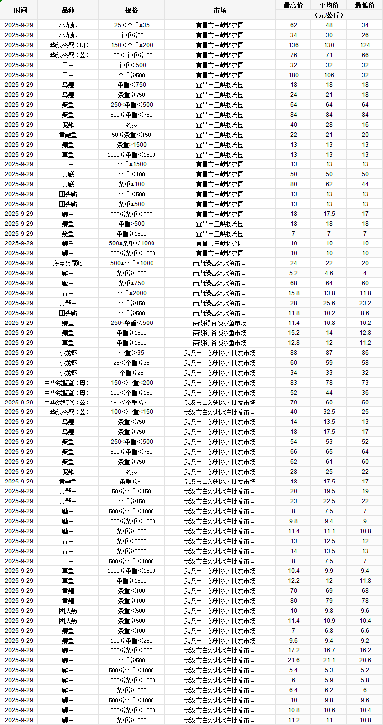说明:以上各行情来源于“湖北省水产品批发市场信息采集分析平台“,经湖北省农业科技超市授权发布。