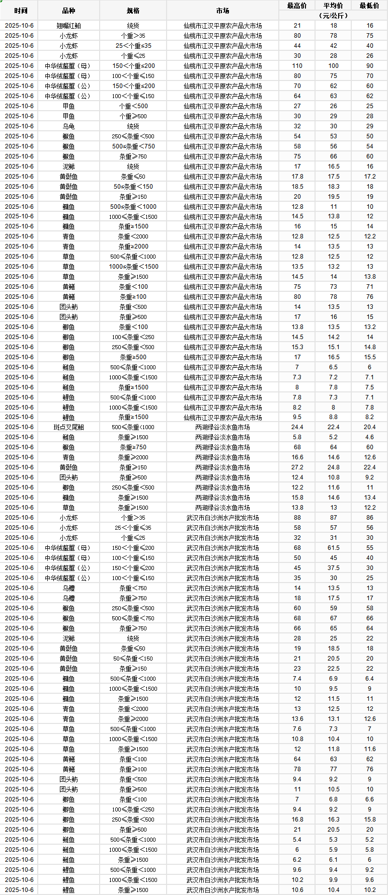 说明:以上各行情来源于“湖北省水产品批发市场信息采集分析平台“,经湖北省农业科技超市授权发布。