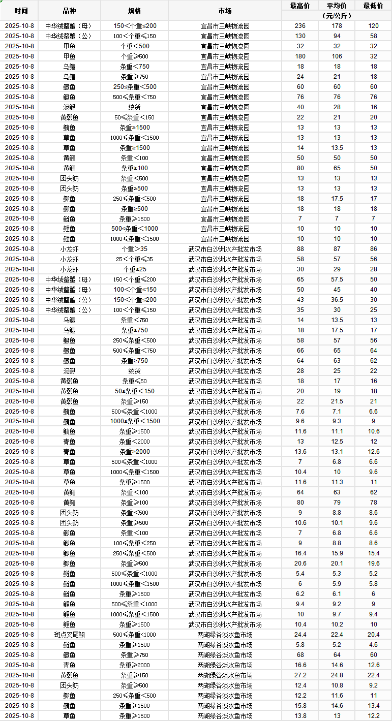 说明:以上各行情来源于“湖北省水产品批发市场信息采集分析平台“,经湖北省农业科技超市授权发布。