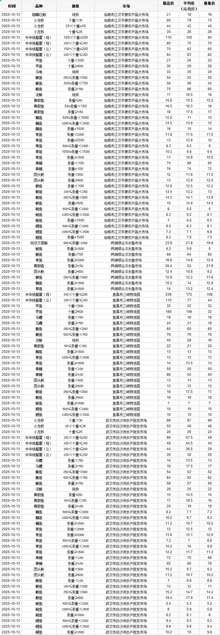 说明:以上各行情来源于“湖北省水产品批发市场信息采集分析平台“,经湖北省农业科技超市授权发布。