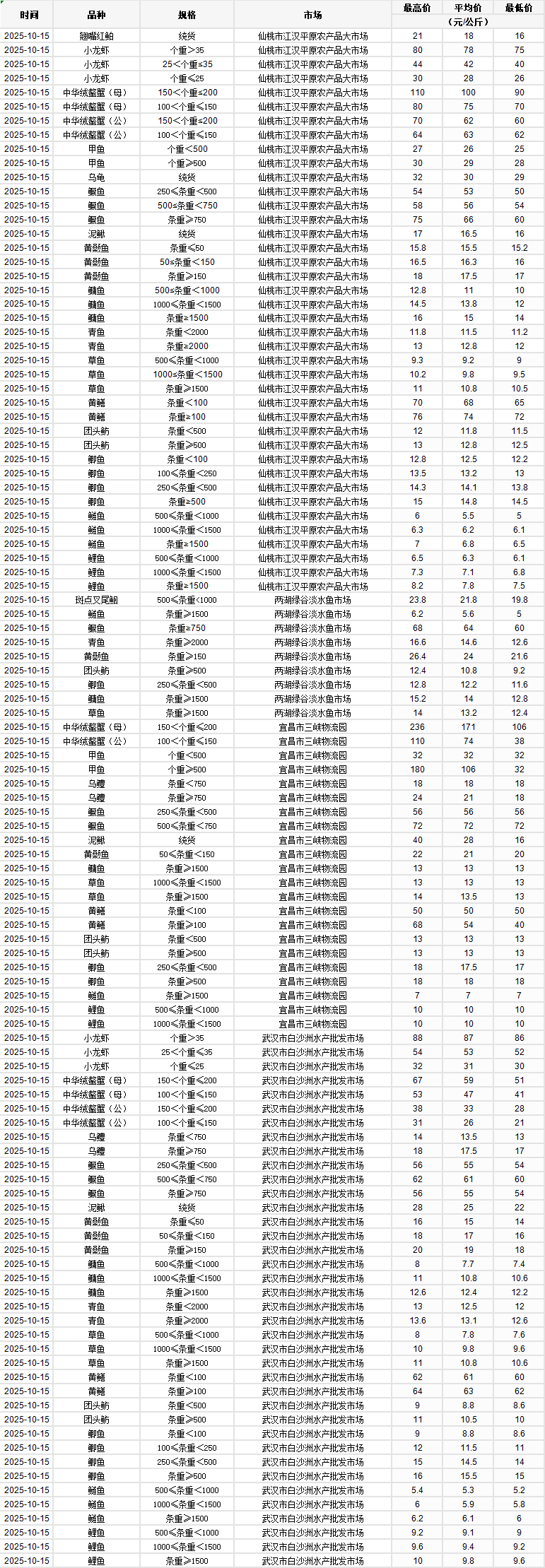 说明:以上各行情来源于“湖北省水产品批发市场信息采集分析平台“,经湖北省农业科技超市授权发布。