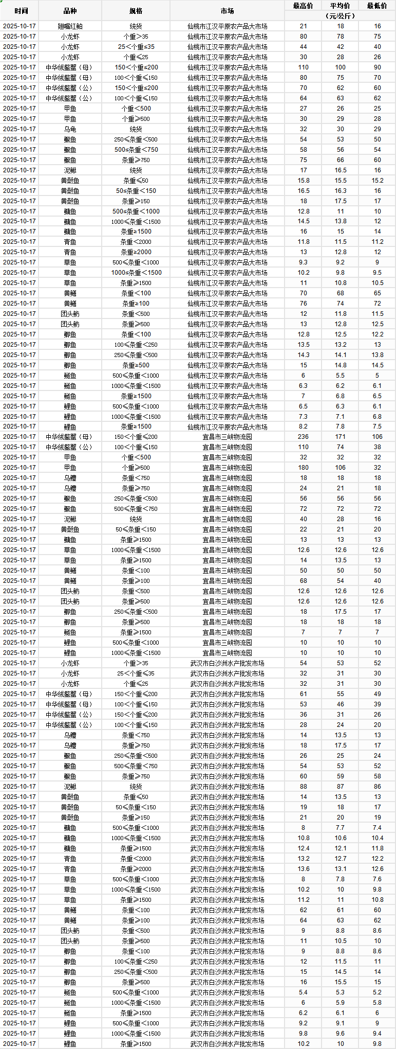 说明:以上各行情来源于“湖北省水产品批发市场信息采集分析平台“,经湖北省农业科技超市授权发布。