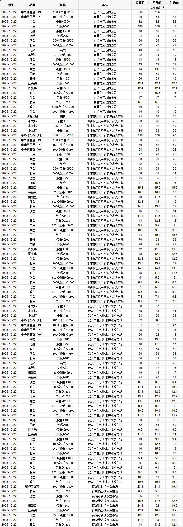 说明:以上各行情来源于“湖北省水产品批发市场信息采集分析平台“,经湖北省农业科技超市授权发布。
