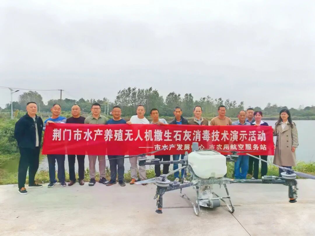 近日,荆门市水产发展中心、荆门市农用航空服务站联合在沙洋县军勇水产养殖专业合作社举办水产养殖无人机撒生石灰技术示范现场会,持续推进无人机在水产养殖领域的应用。
