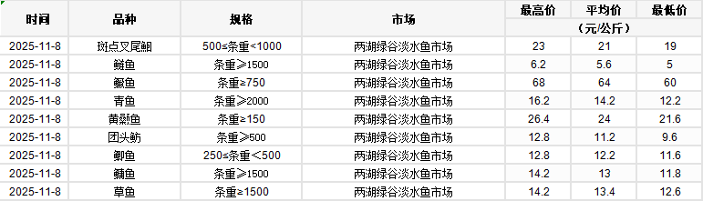 说明:以上各行情来源于“湖北省水产品批发市场信息采集分析平台“,经湖北省农业科技超市授权发布。