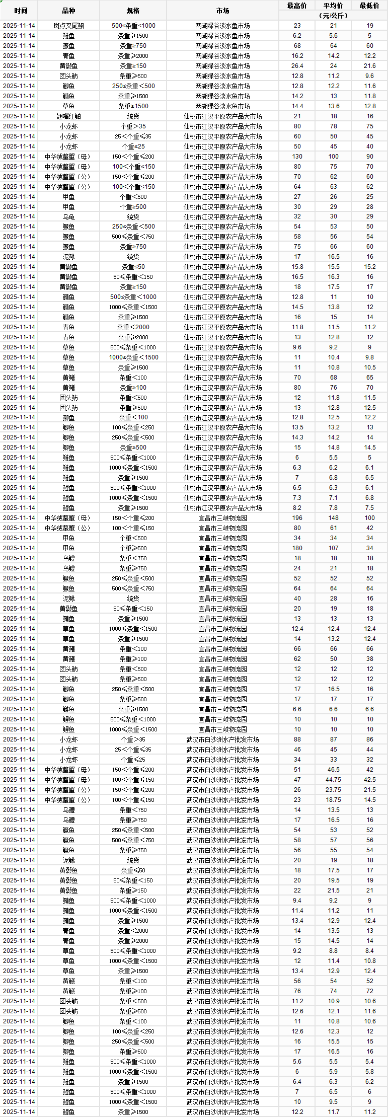 说明:以上各行情来源于“湖北省水产品批发市场信息采集分析平台“,经湖北省农业科技超市授权发布。
