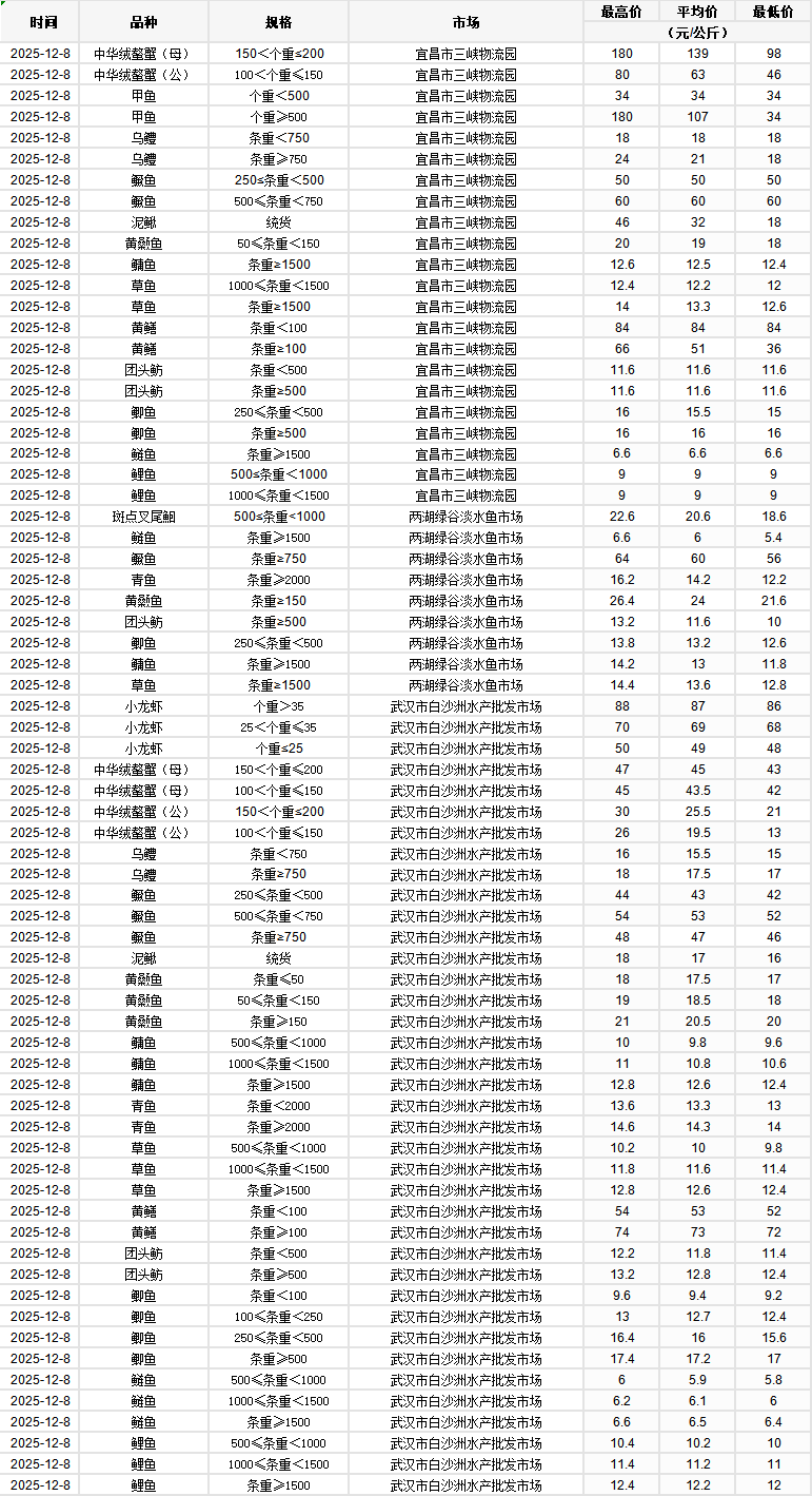 2025年12月8日行情|湖北省主要水产品价格明细
