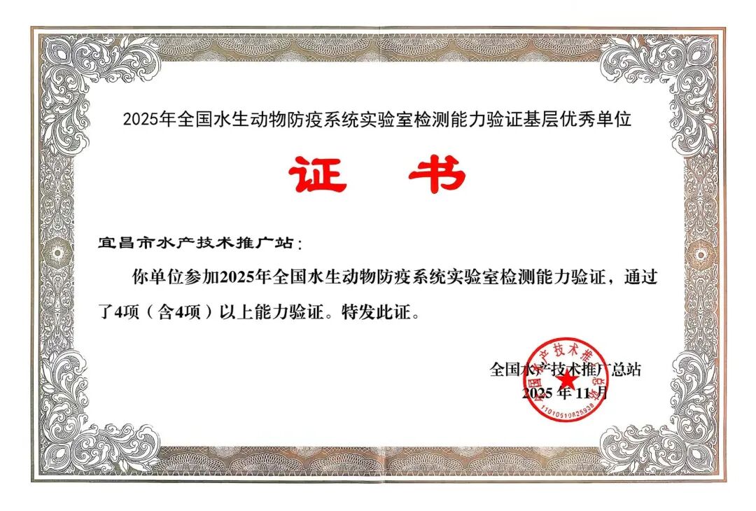 宜昌市水产站水生动物疫病防控监测区域中心通过12项能力验证通过项目数量全省第一,同时获得2026年度国家及省级水生动物疫病监测计划的相应疫病检测实验室备选资格。
