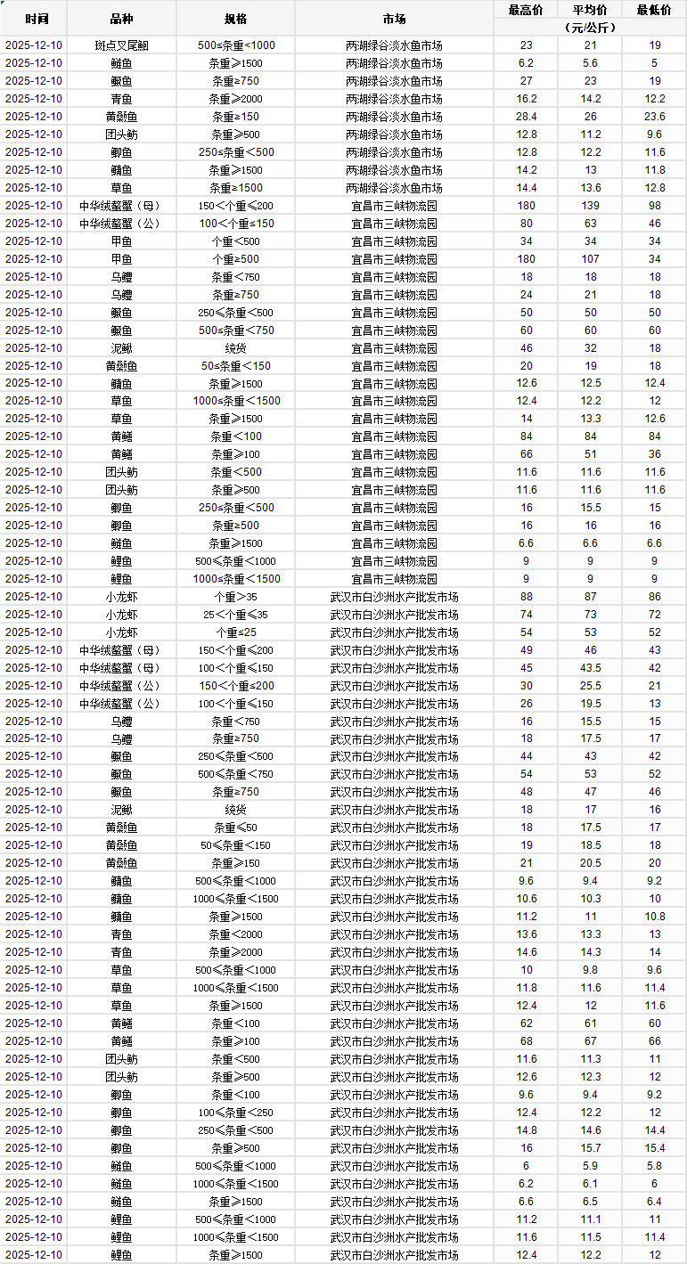 2025年12月10日行情|湖北省主要水产品价格明细