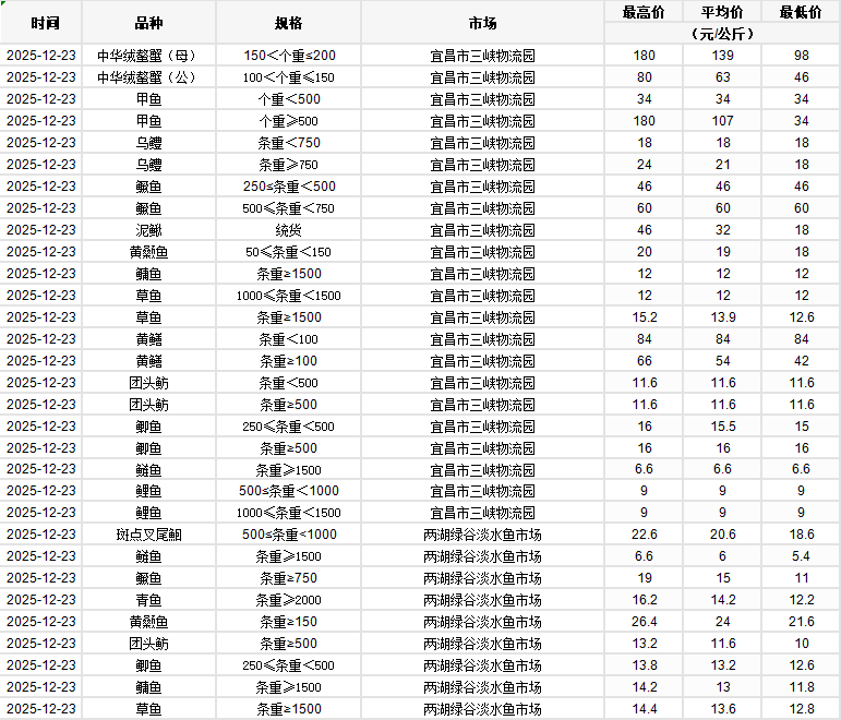 2025年12月23日行情|湖北省主要水产品价格明细