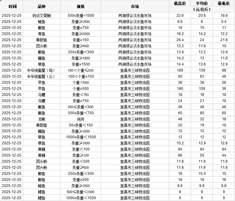 2025年12月25日行情|湖北省主要水产品价格明细