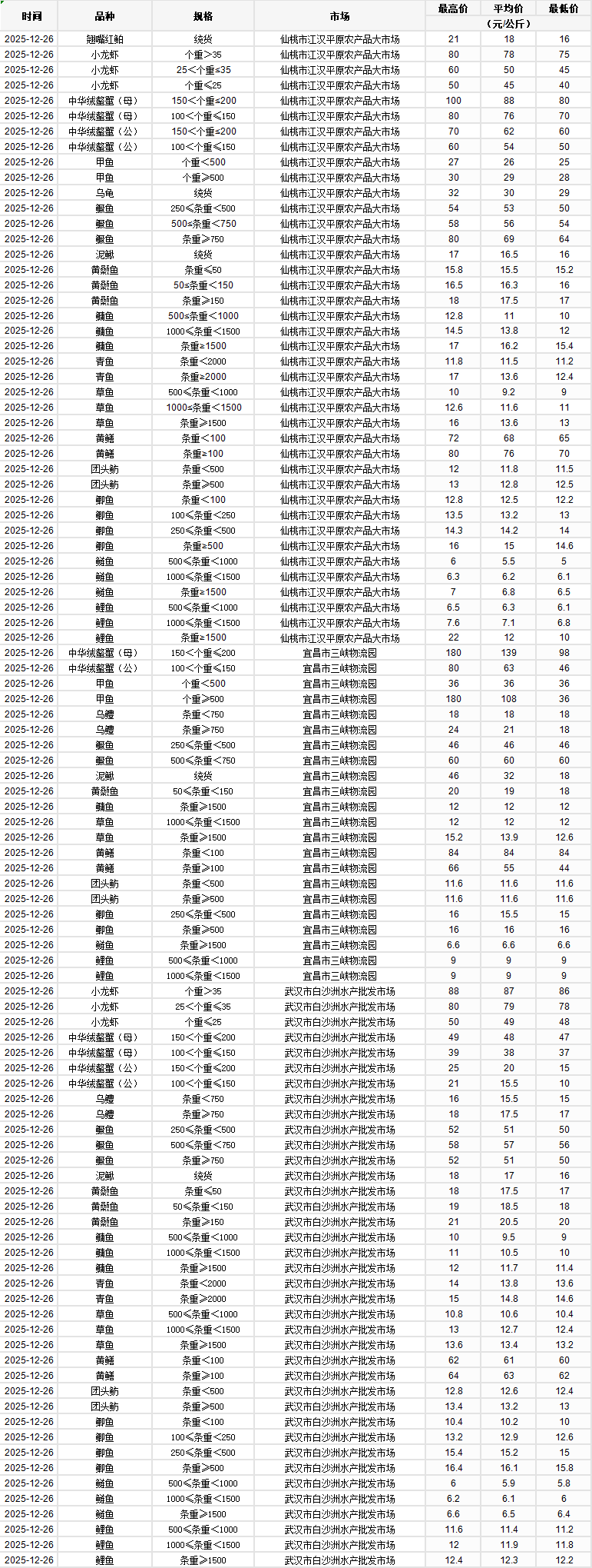 2025年12月26日行情|湖北省主要水产品价格明细
