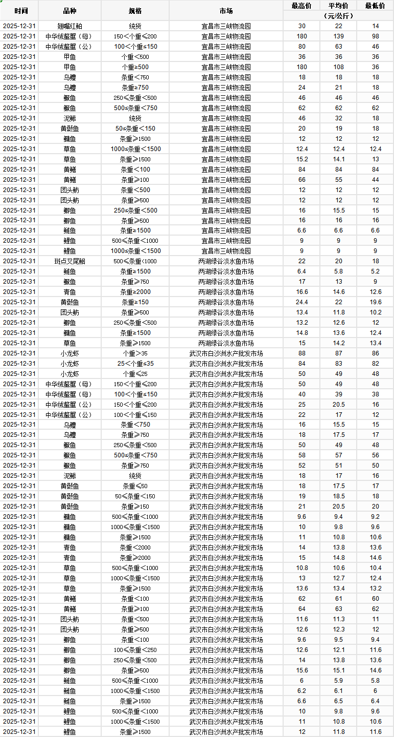 说明:以上各行情来源于“湖北省水产品批发市场信息采集分析平台“,经湖北省农业科技超市授权发布。