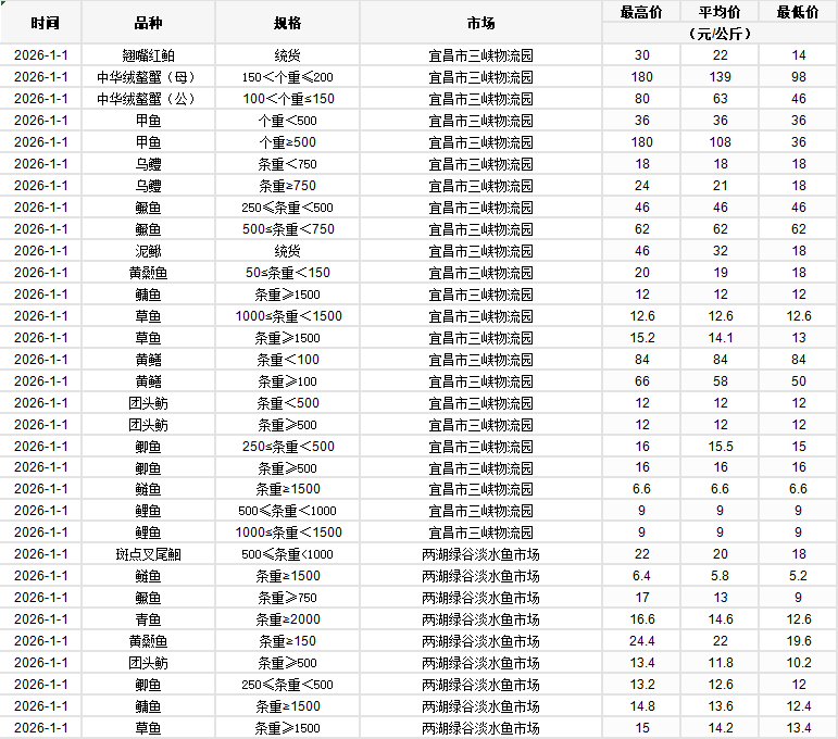 2026年1月1日行情|湖北省主要水产品价格明细
