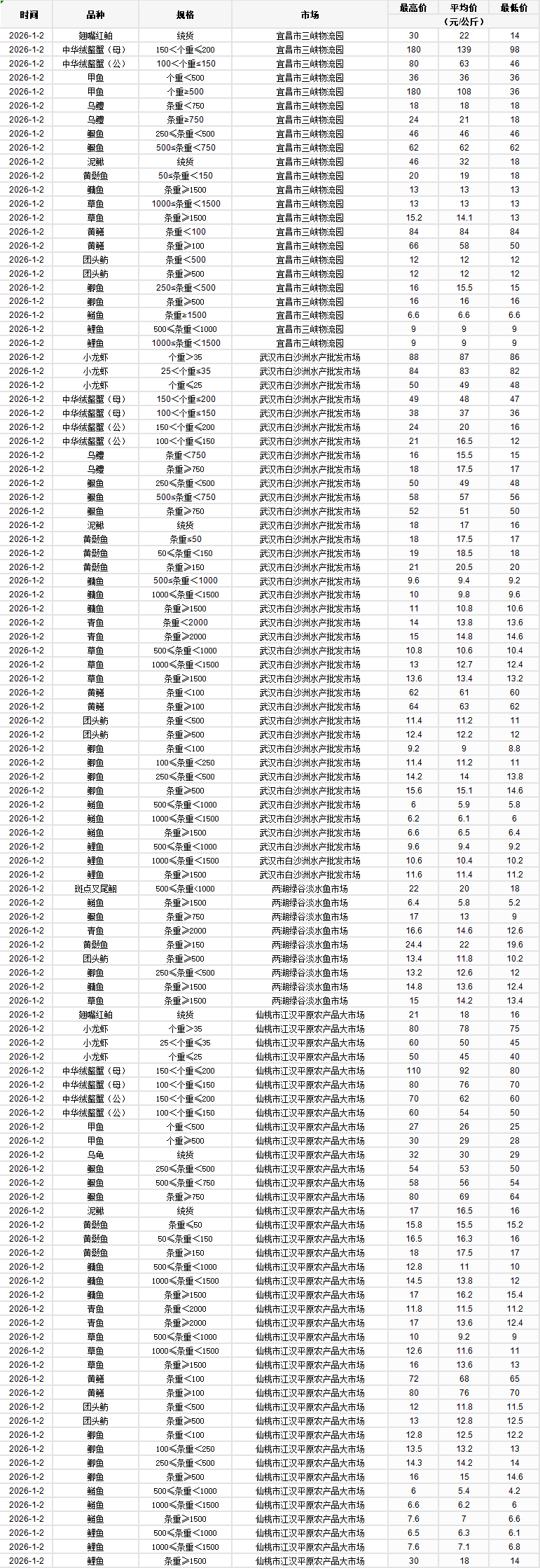 说明:以上各行情来源于“湖北省水产品批发市场信息采集分析平台“,经湖北省农业科技超市授权发布。