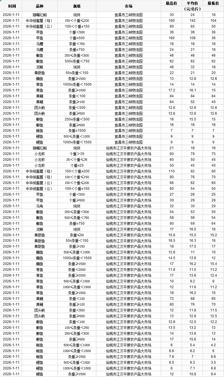 说明:以上各行情来源于“湖北省水产品批发市场信息采集分析平台“,经湖北省农业科技超市授权发布。