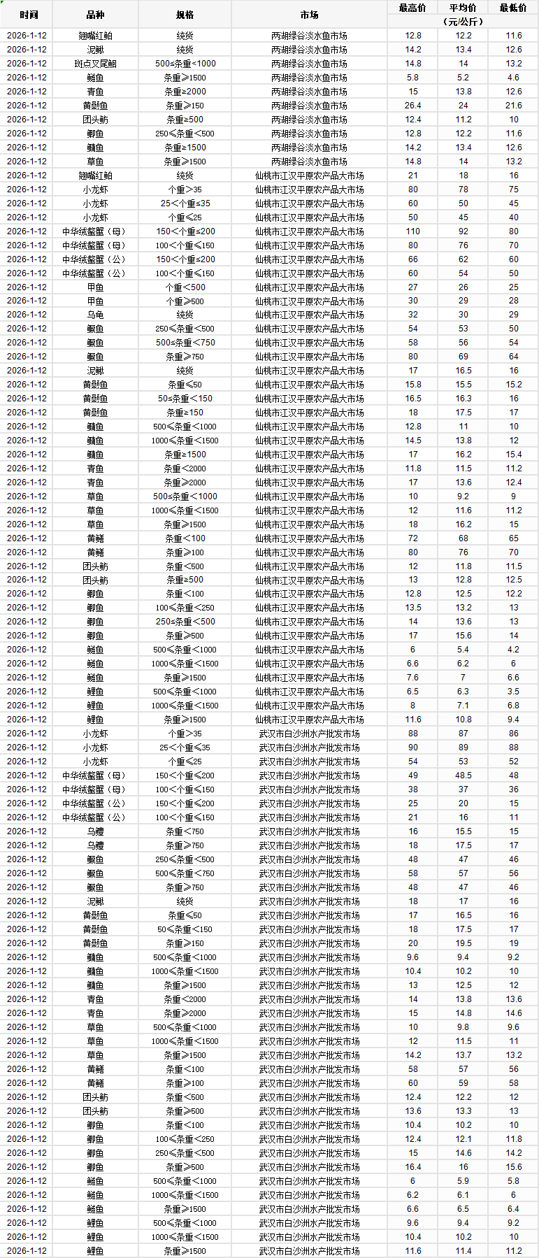 说明:以上各行情来源于“湖北省水产品批发市场信息采集分析平台“,经湖北省农业科技超市授权发布。